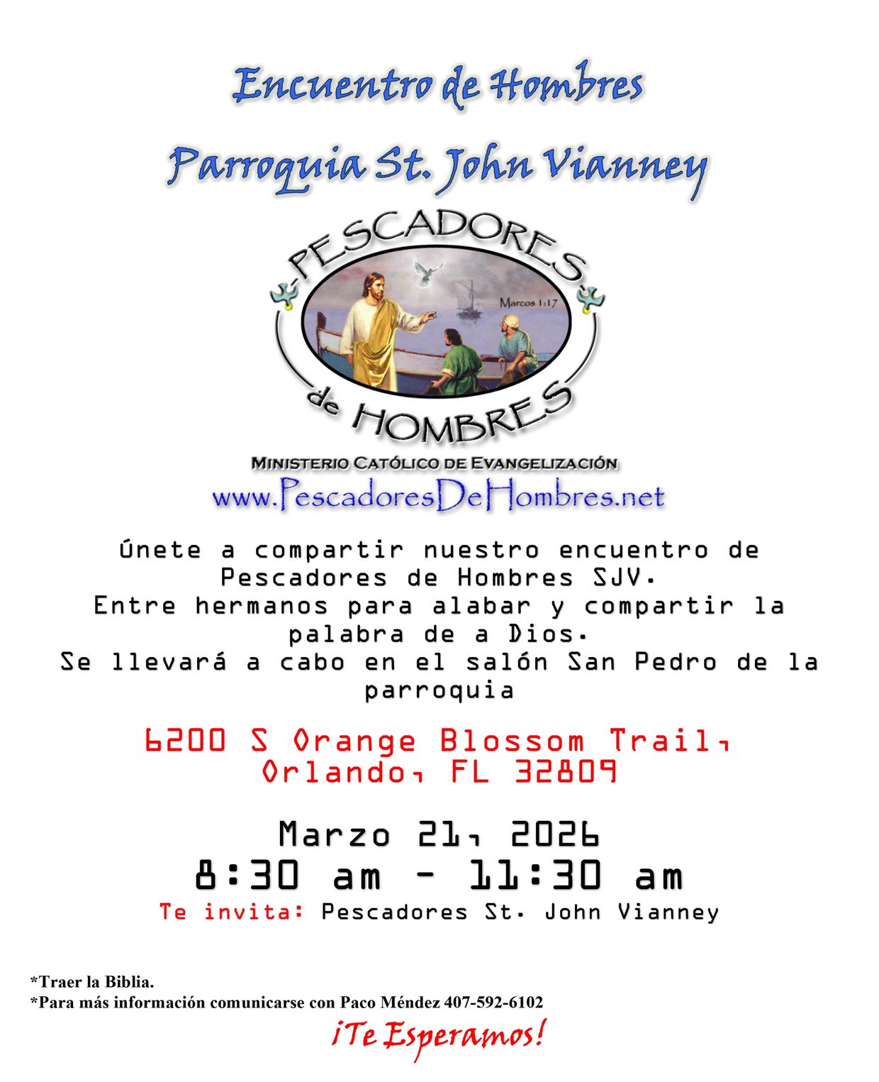 Para el año 1992, la hermana Priscila Cora, coordinadora del Círculo de Oración de Good Shepherd, Orlando, Florida y de Las Mujeres del Pozo, presentó la inquietud de que los hombres de dicha parroquia comenzaran unas reuniones entre hombres solamente. Carlos Ortiz fue el portavoz de esta primera reunión en Good Shepherd donde se encontraban Armando Colón, Frank Ramírez, Jessie Torres, José Echevarría, entre otros hombres de diferentes parroquias. En oración, se sugirieron varios nombres para el ministerio y fue seleccionado “Pescadores De Hombres”. Carlos Ortiz siendo el portavoz del grupo pasó a ser el primer coordinador del ministerio.